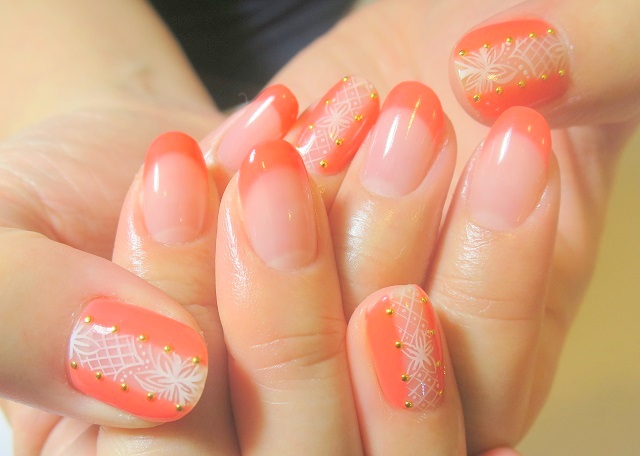 南国らしいオレンジと女性らしいレースの組み合わせで大人リゾートネイルです!